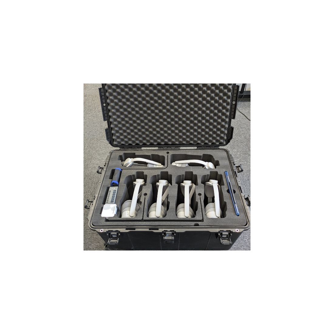 Im Inneren des Koffers finden Sie einen maßgeschneiderten Schaumstoff, der Platz für 6 Pico 4 Ultra Enterprise-Headsets sowie deren Controller bietet. Jeder Platz ist präzise angepasst, um einen optimalen Halt der Ausrüstung zu gewährleisten. Die Headsets sind einzeln geschützt, was das Risiko einer Beschädigung während des Transports verringert.