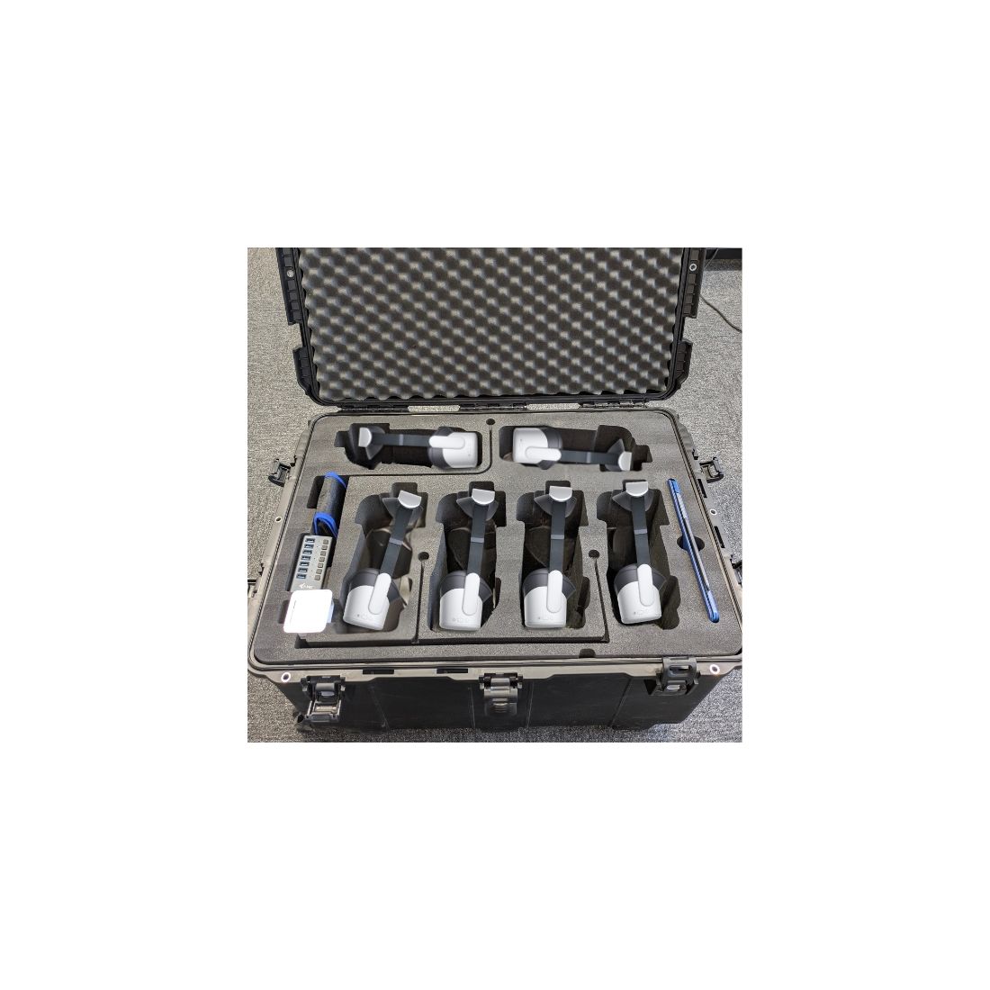 À l’intérieur de la valise, vous trouverez une mousse usinée et découpée sur mesure permettant d’accueillir 6 casques Pico G3+ ainsi que leurs contrôleurs. Chaque emplacement est précisément ajusté afin d’assurer un maintien optimal du matériel. Les casques sont protégés individuellement, ce qui limite les risques de détérioration lors du transport.